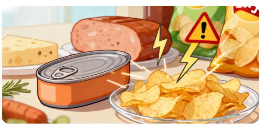 腌制食品、快餐、酱菜含大量“隐形盐”,每日盐摄入量建议不超过5克。过量盐分摄入可能会升高血压,加速血管硬化。