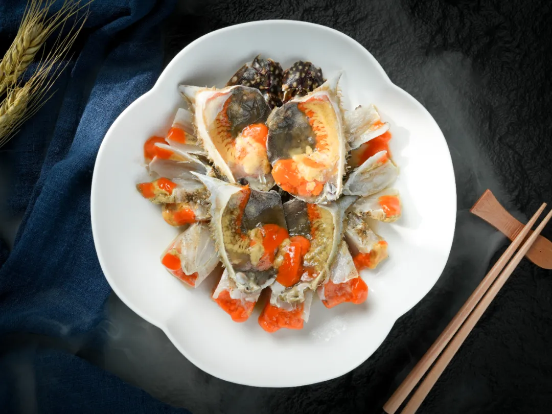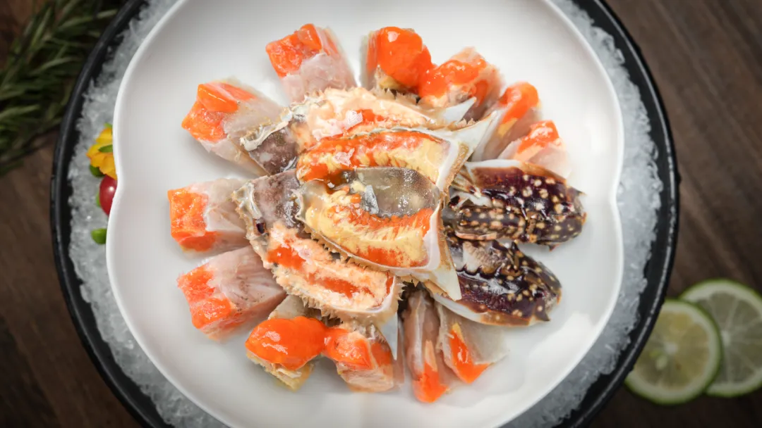若说岱山冷菜有C位,那呛蟹可谓是当之无愧。这道传承千年的渔家味,是东海梭子蟹与岱山海盐的浪漫相拥。精选肥壮膏满的雌梭子蟹,以岱山本地海盐调卤,渔家老法压石腌制,让盐分缓缓渗入其中。