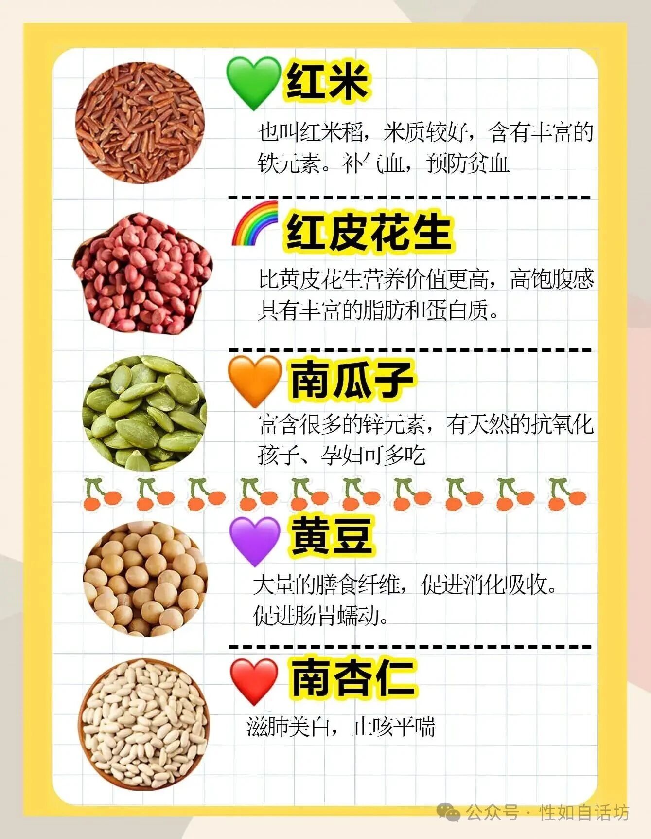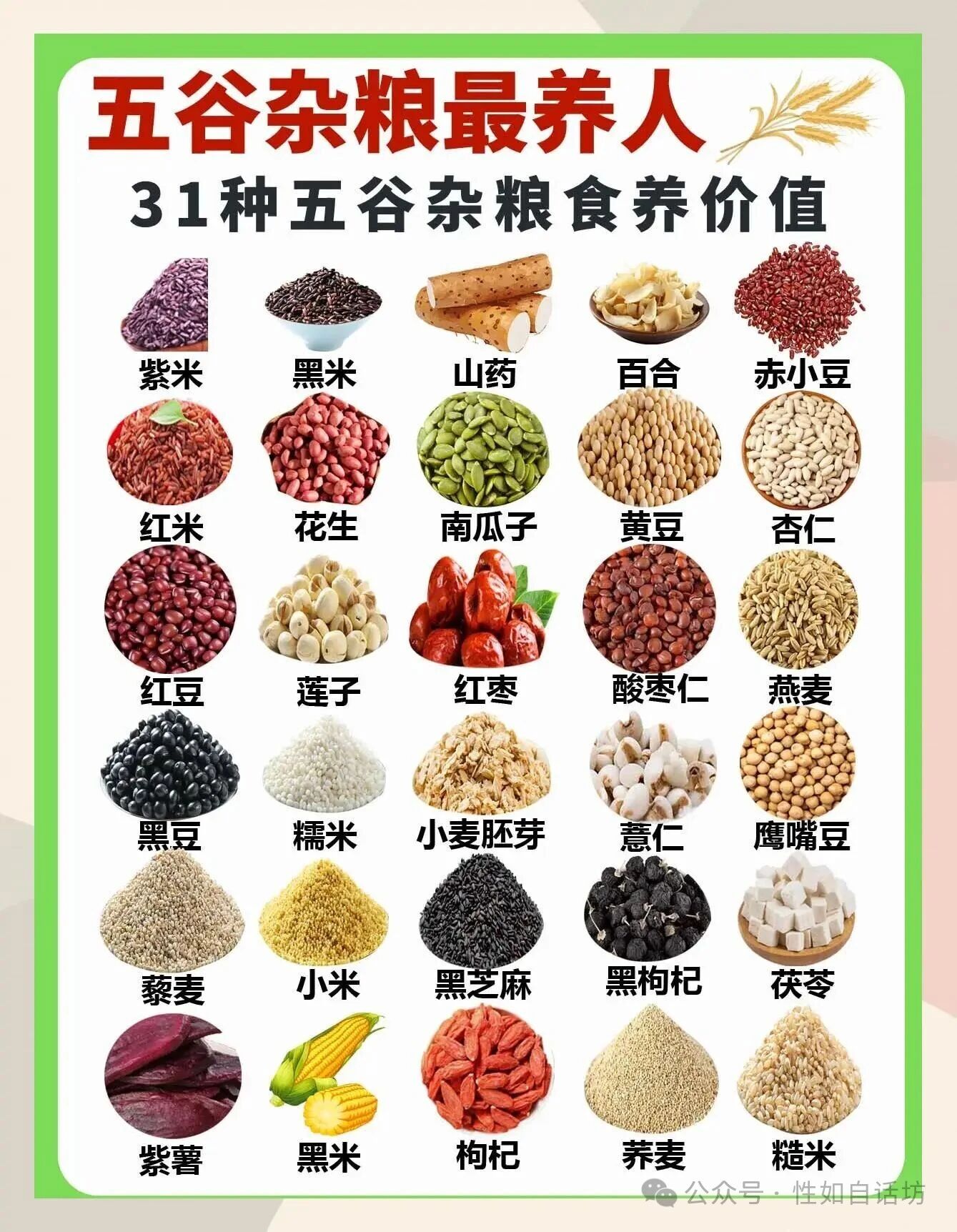五谷的重要性:五谷能满足人体大部分需要,是人体气血的主要来源,在食物中应占主体地位,国家营养协会建议谷物占食物总量的 50%左右。