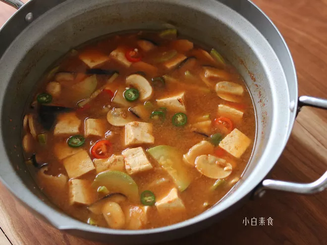 3. 把有机豆瓣酱加入搅开继续盖上锅盖小火煮10分钟以上,让蔬菜软烂入味即可。