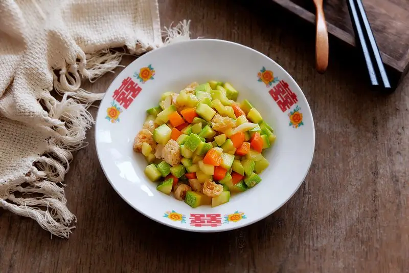 2. 胡萝卜切小丁,西葫芦切小丁,生姜切片。