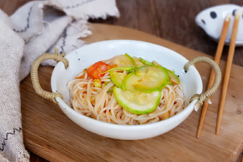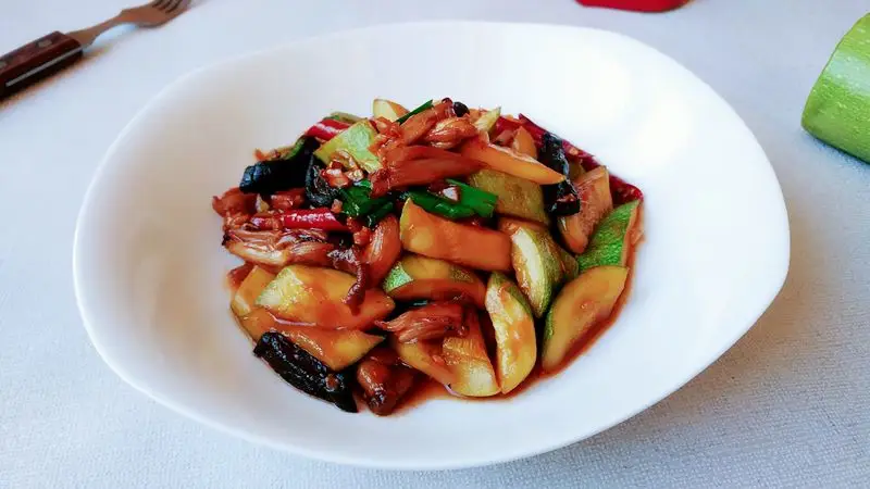 6. 继续翻炒到西葫芦变软,淋上之前调好的汁即可