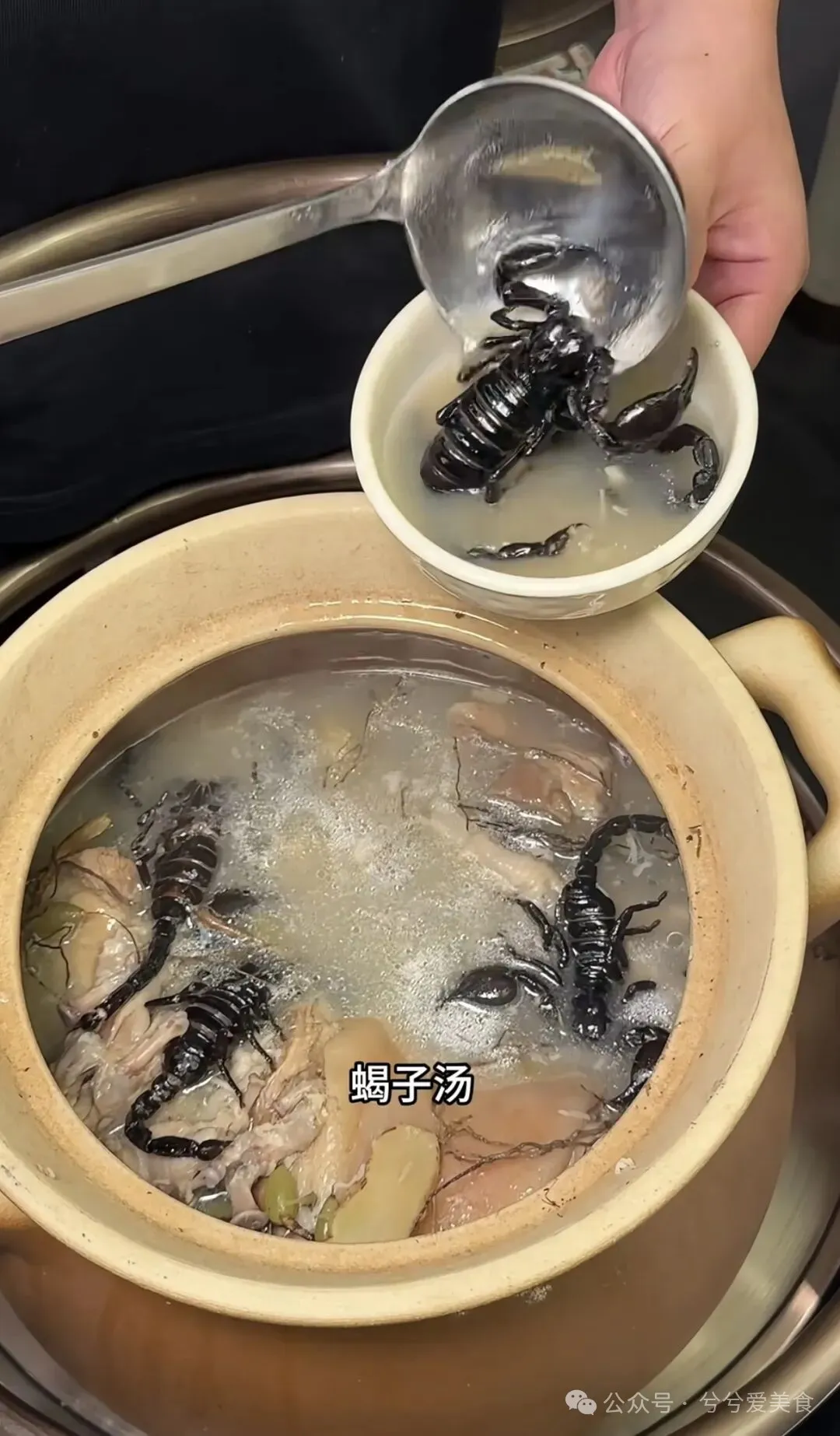 然后,重头戏来了!汤上桌了!我对着那盅蝎子汤,做了半天心理建设,眼睛一闭,心一横,喝了一小口……咦?! 等等!这味儿不对啊!