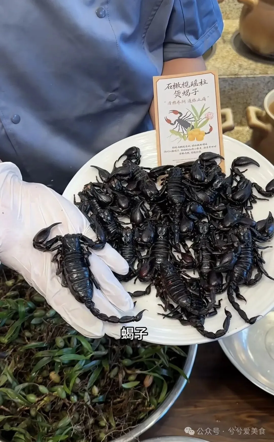 第一个吓到我的,就是那蝎子汤! 我的天,活的蝎子我是隔着屏幕在动物世界看过,这炸好了泡在料里的,我是头一回见!一只只的,腿脚爪子都清清楚楚,视觉冲击力太强了!我当时心里就咯噔一下,这玩意儿…能喝?喝了不会躺板板吧?旁边一个本地大叔看我吓得够呛,乐呵呵地跟我说:“后生仔,莫惊啦!这个好嘢来的,祛湿的!” 广东朋友们的食谱,是不是都参考了《西游记》啊?为了口汤,也太拼了吧!