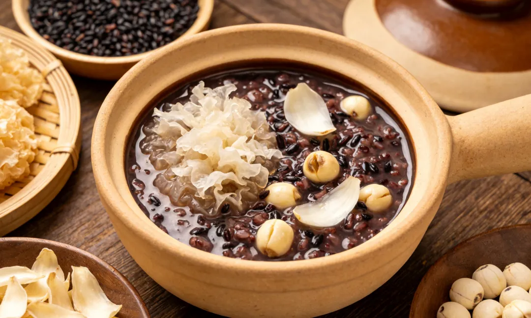 黑米提前浸泡,和银耳、百合、莲子一起下锅煮40分钟,黑米富含花青素,百合莲子安神养心。