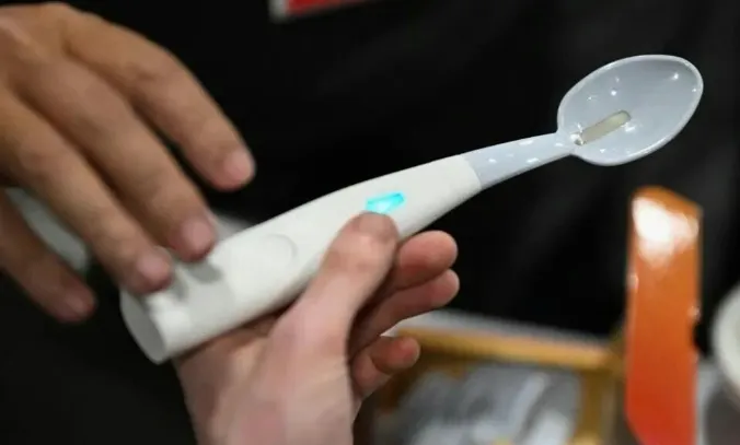 麒麟增味电子盐勺于2025年1月5日在内华达州拉斯维加斯举行的消费电子展(CES)前夕亮相,该款产品利用微弱电流浓缩食物中的钠离子分子,从而增强低钠食品的鲜味和咸味,以鼓励人们减少盐摄入。(图片来源:PATRICK T. FALLON/AFP via Getty Images)