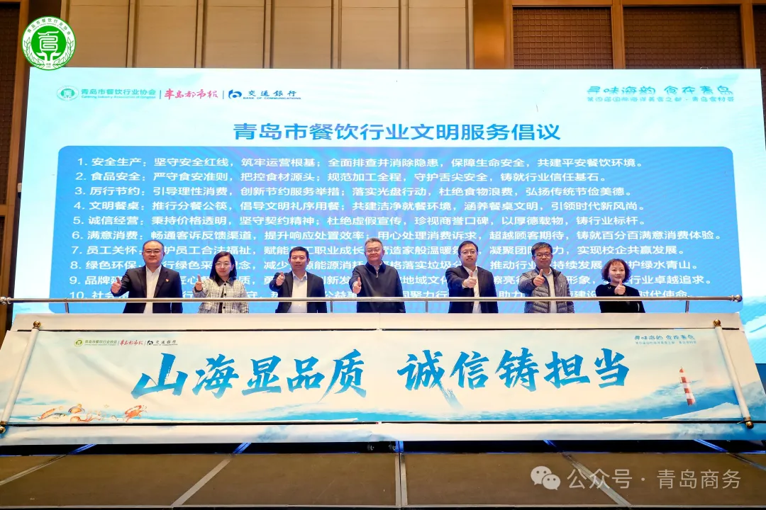 随后,在热烈的掌声中,由青岛市餐饮行业协会携手各区市会长联合发起的《餐饮行业高质量发展倡议书》庄严宣读。倡议从“安全生产、食品安全、厉行节约、文明餐桌、诚信经营、满意消费、员工关怀、绿色环保、品牌建设、社会责任”十大维度发出行业强音。