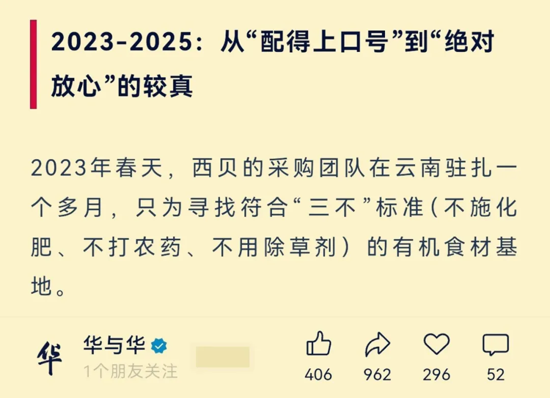 如何不符?分析者指出,此前华与华在案例分享中讲过,2023年西贝的采购团队曾经在云南驻扎一个多月,寻找符合“三不”标准(不施化肥、不打农药、不用除草剂)的有机食材基地。然而从2025年9月份媒体记者曝光的一份材料显示,西贝后厨用的是有机西兰花,供货商不是来自云南,而是来自山东泰安的一家食品企业。