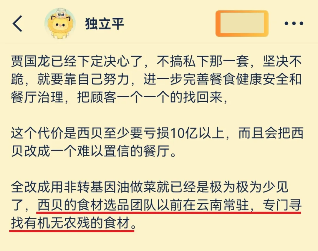 关于这件事,实际上在一名“知情人”的文字叙述中也有所提及。这名“知情人”就是目前在网络上被定义为西贝“幕后公关”的知名网友“独立平”。