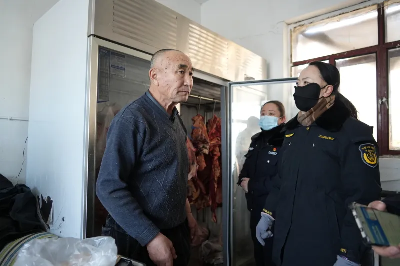 在家佳乐市场加力木汗牛羊肉店,执法人员围绕肉产品来源追溯、储存条件、标签标识等方面进行检查,确保肉产品来源合法、安全可溯、标识规范。在现场,顾客叶买西·尼亚孜对食品安全管控工作给予肯定。
