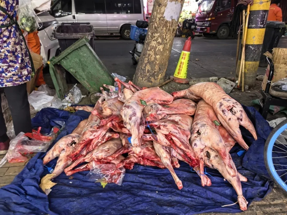 1月22日清晨,记者来到汉口聚才路与三眼桥北路交会处的露天生鲜市场,只见一家连锁生鲜卖场外停着一辆运送生鲜肉品的冷藏车。很快,一只只已经屠宰、分件的肉羊被送到了店门口,由工作人员逐一挂起来售卖。