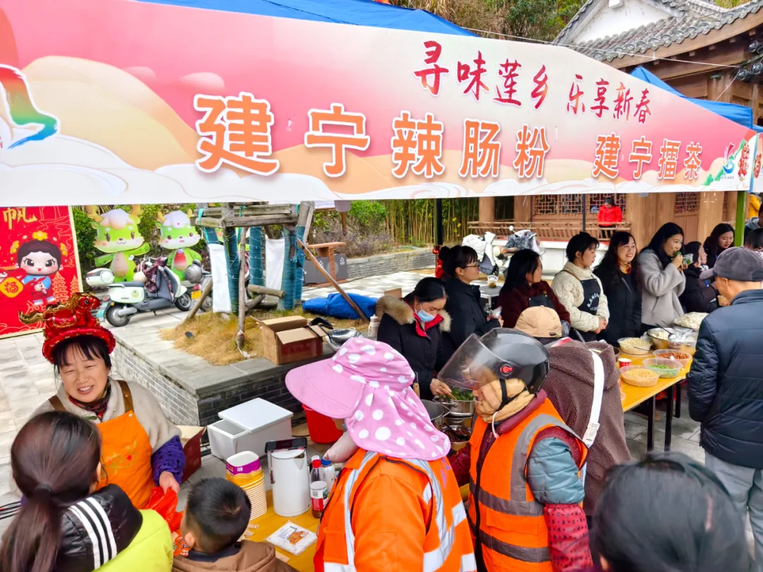 活动现场,暖菇糍、笋饼、米豆腐、擂茶等建宁特色非遗美食一字排开,香气四溢;古筝雅乐悠扬响起,与书写春联的笔墨清香交织,构成一幅生动温馨的民俗画卷。