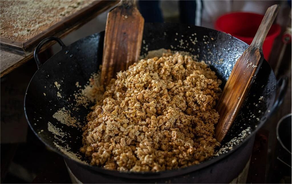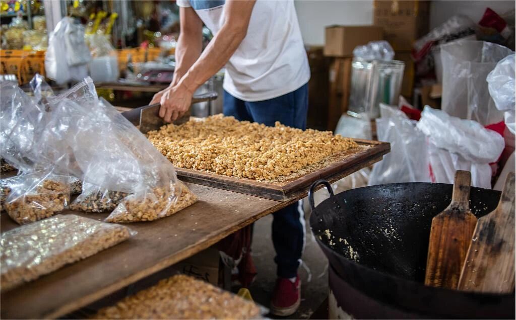 经验老道的老师傅手艺高超,全在于控制花生与糖浆的配比上:糖不够,花生难以凝结,酥糖容易散架;糖太多,成品又不够酥松,口感也发腻。因为不用任何粘合剂和添加剂,做出香而不腻、甜而不齁、酥而不散的花生糖,也只能靠双手的经验掌握食材配比、估算最适当的温度。