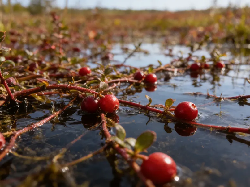 蔓越莓是杜鹃花科越橘属的常绿小灌木浆果,生长在北半球寒冷湿地,果实鲜红饱满。因采收时果农会向沼泽注水使果实浮起,故得“水中采收的红色宝石”美名,北美原住民最早将其用作食物和天然染料。