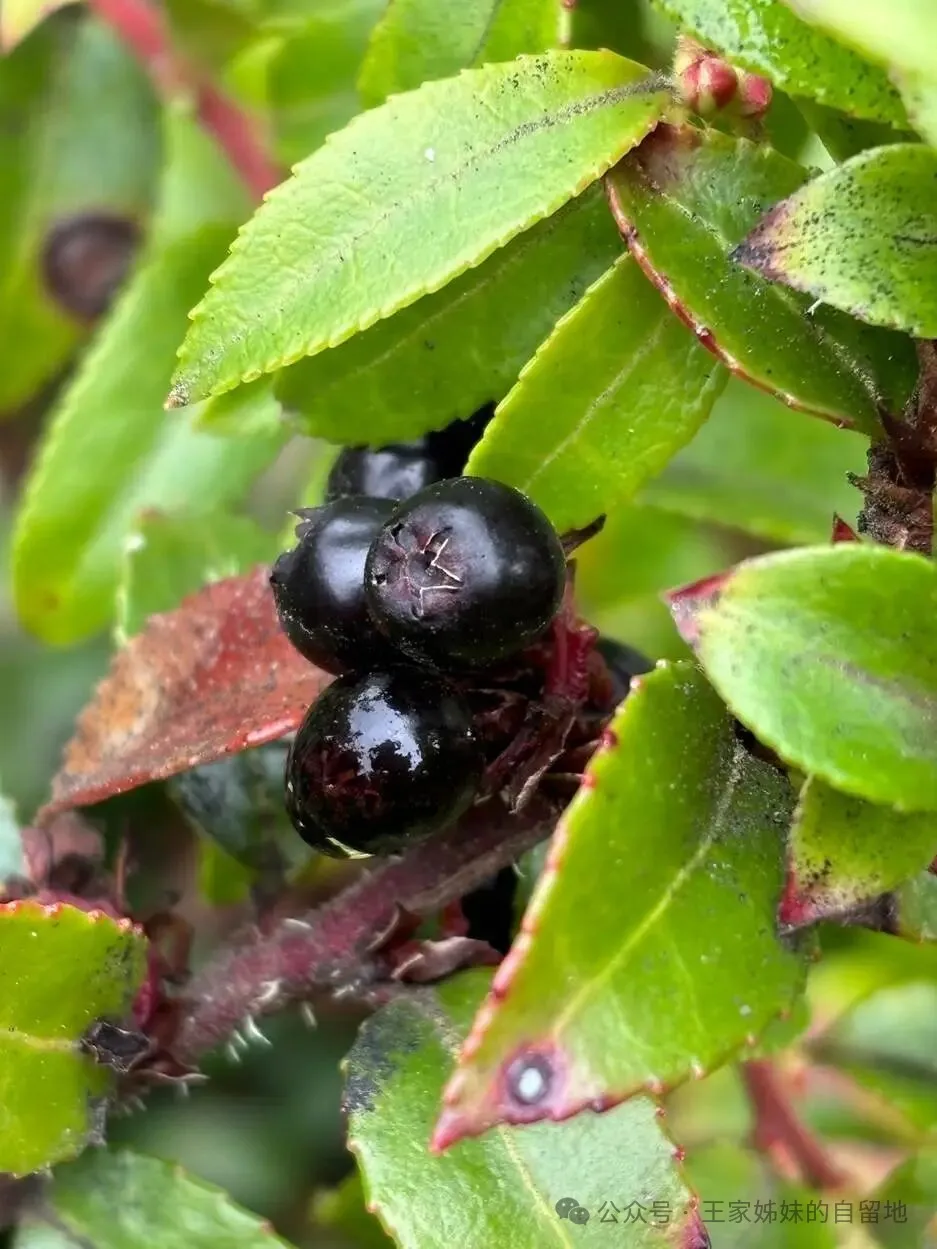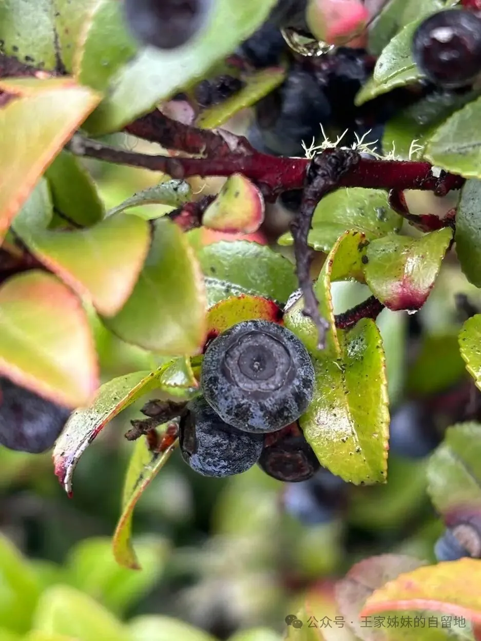 我遇到的越橘,似乎是两种,它们的灌木丛和叶子都是一样的,但果实有所不同。一种果实是黑黑的,每一个果蒂那里都是一颗漂亮的小星星⭐️,另一种的果实,则更像蓝莓,是带白霜的蓝色,果蒂那里也不是星星,而是圆圈⭕️,像个小花朵。