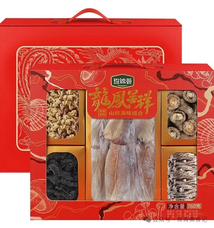 食材搭配:礼盒内食材丰富,有365克鱿鱼干、150克花蛤干、55克海带结、50克×2的紫菜、50克香菇和40克鹿茸菇,山珍海味齐聚。