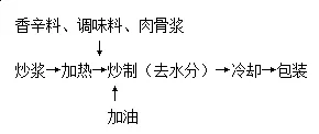 肉(瘦、肥搭配)→烫洗(70-80℃),除异腥味→切小肉丁→开锅煮1h(八角、姜、葱 等香辛料)→装复合袋→封口杀菌
