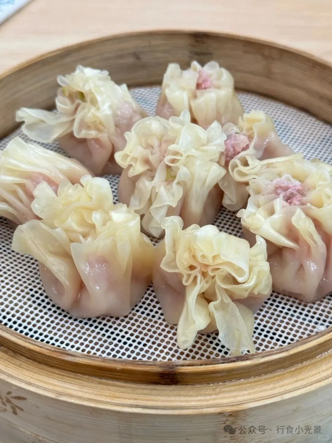 烧麦皮用开水烫面加米粉,薄得透光还坚韧,裹满馅料也不破。馅料选牛肋条、牛里脊等嫩部位,剁成肉糜加葱姜调味,不加水不加淀粉,纯纯肉香,咬开肉汁喷溅,烫嘴都舍不得松口。