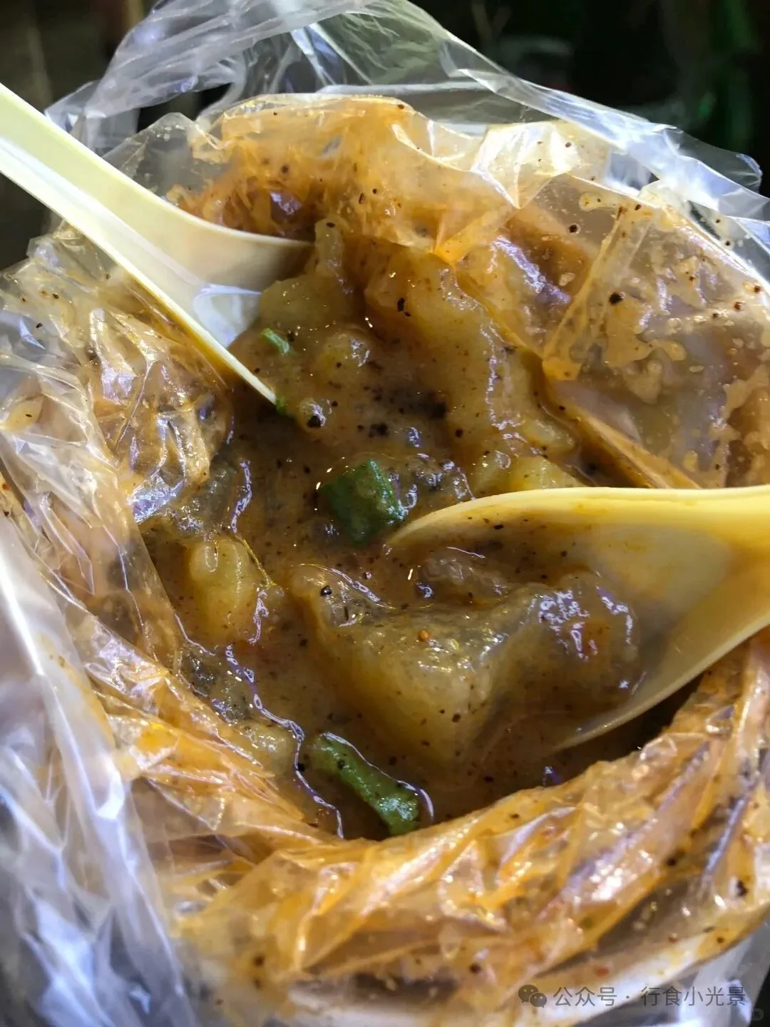 用小铁铲铲着吃,外皮焦脆、内里软糯,多种香味在嘴里交织,黏糊糊的口感超上头。有的小摊加一勺土豆泥,和焖子混在一起更糯叽叽,女生小孩都爱疯了。