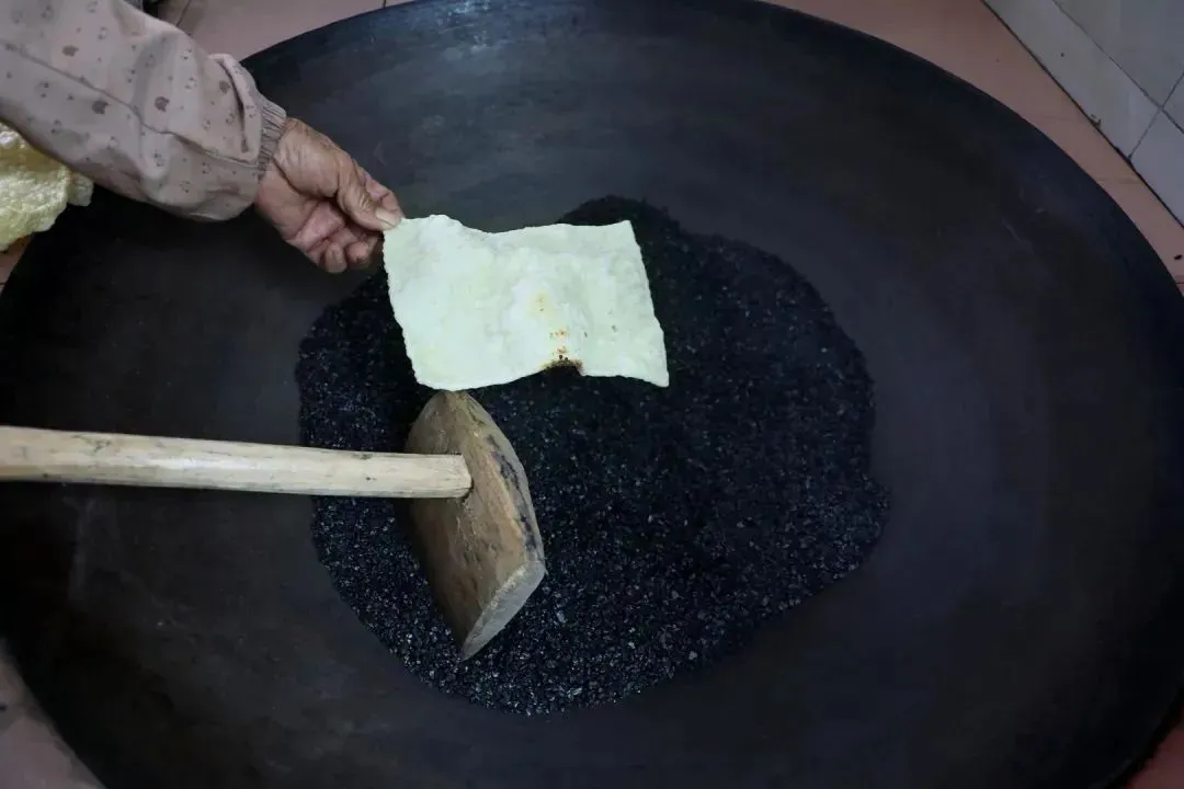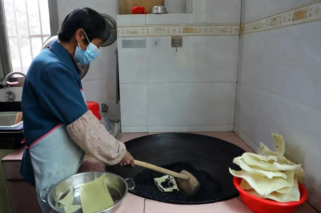 客家地区一直以来都有把米浆蒸制成“米皮”食用的习俗。为了便于储存,客家人把“米皮”经由沙子炒或油炸至膨化后食用、保存。正因为沙炒粄皮或油炸粄皮没有任何添加剂,且滋味纯正香脆、入口即化,所以一直以来都深受客家人的青睐,更升级成为逢年过节餐桌上一道特色小吃。