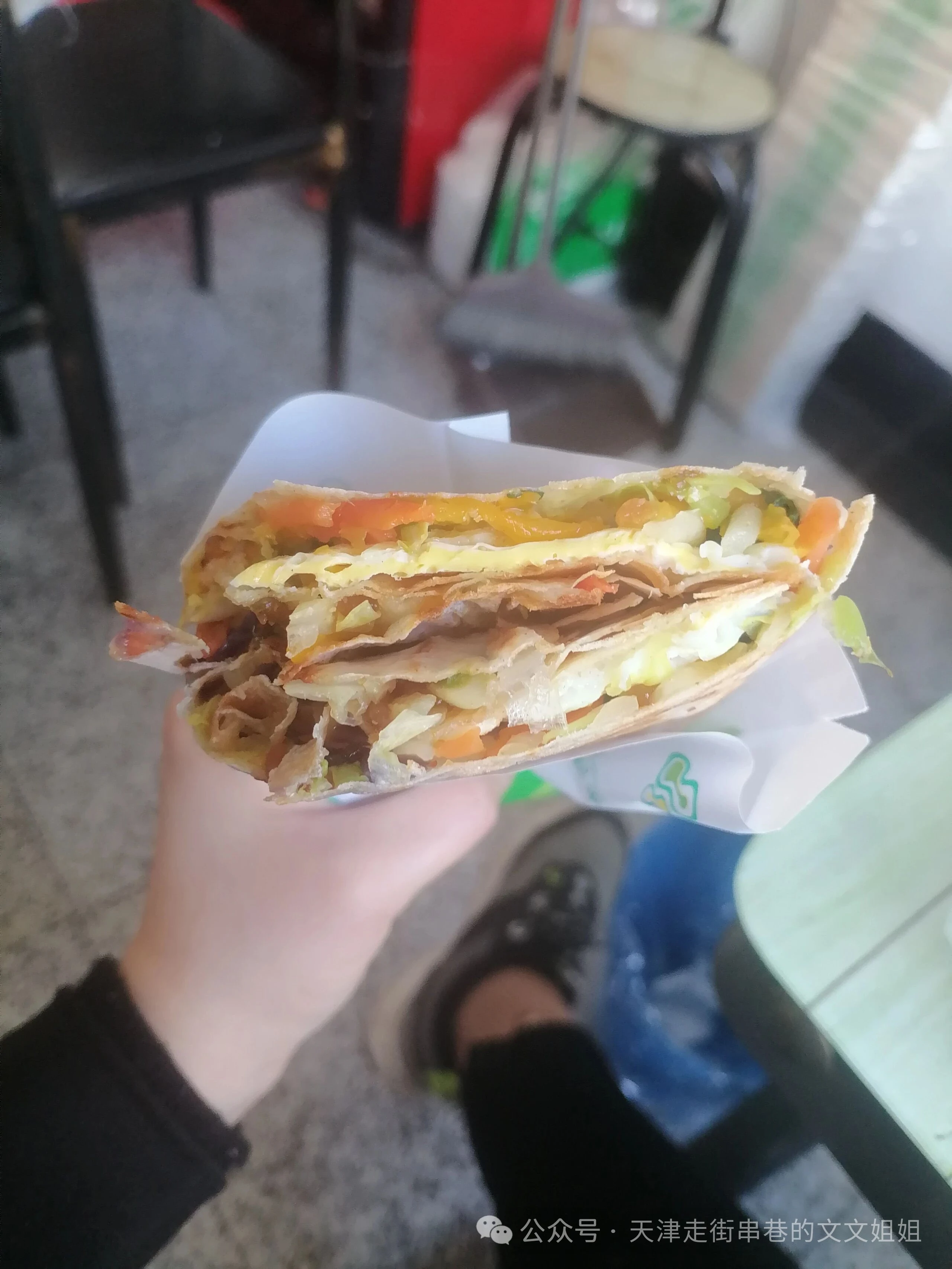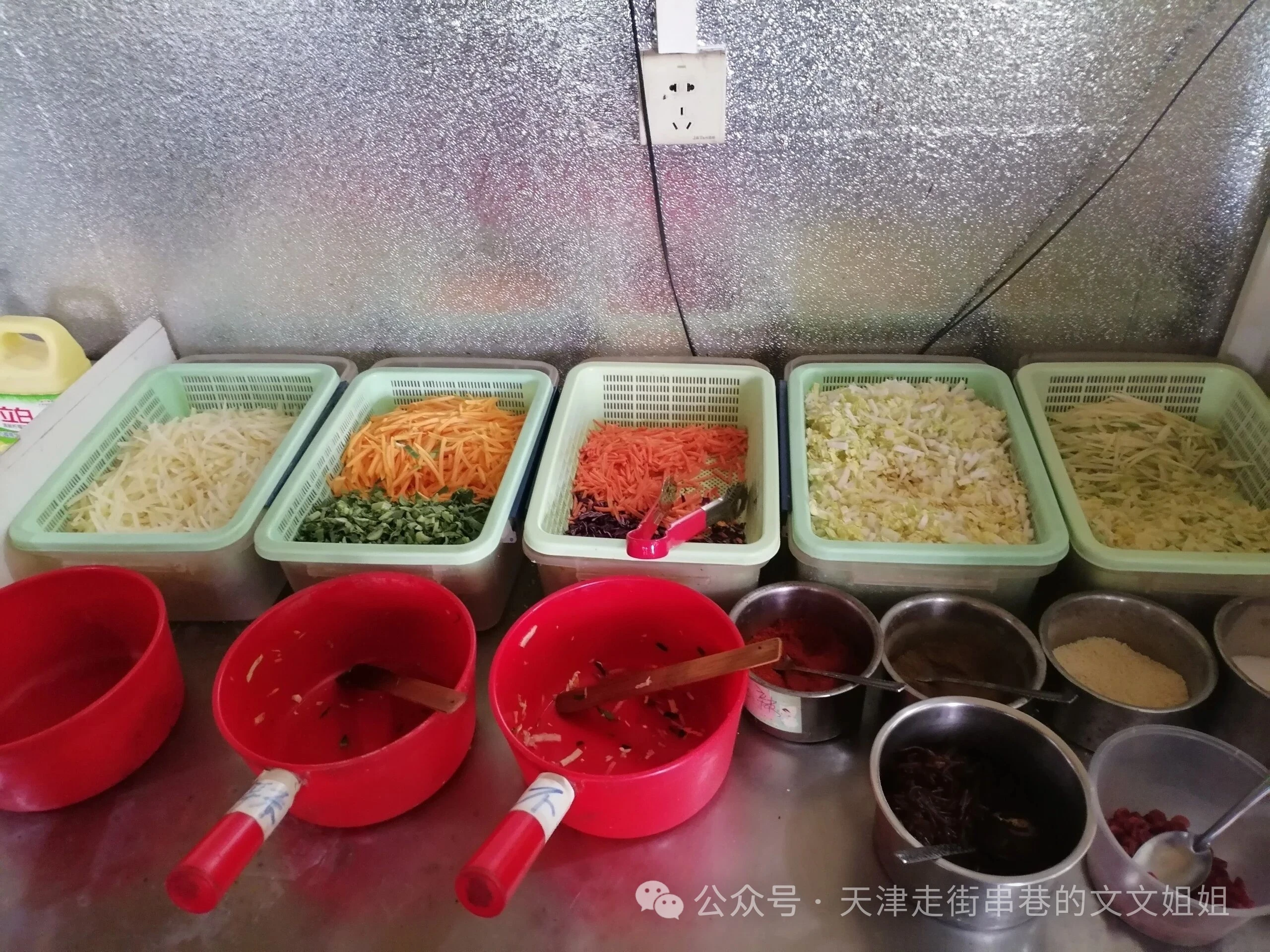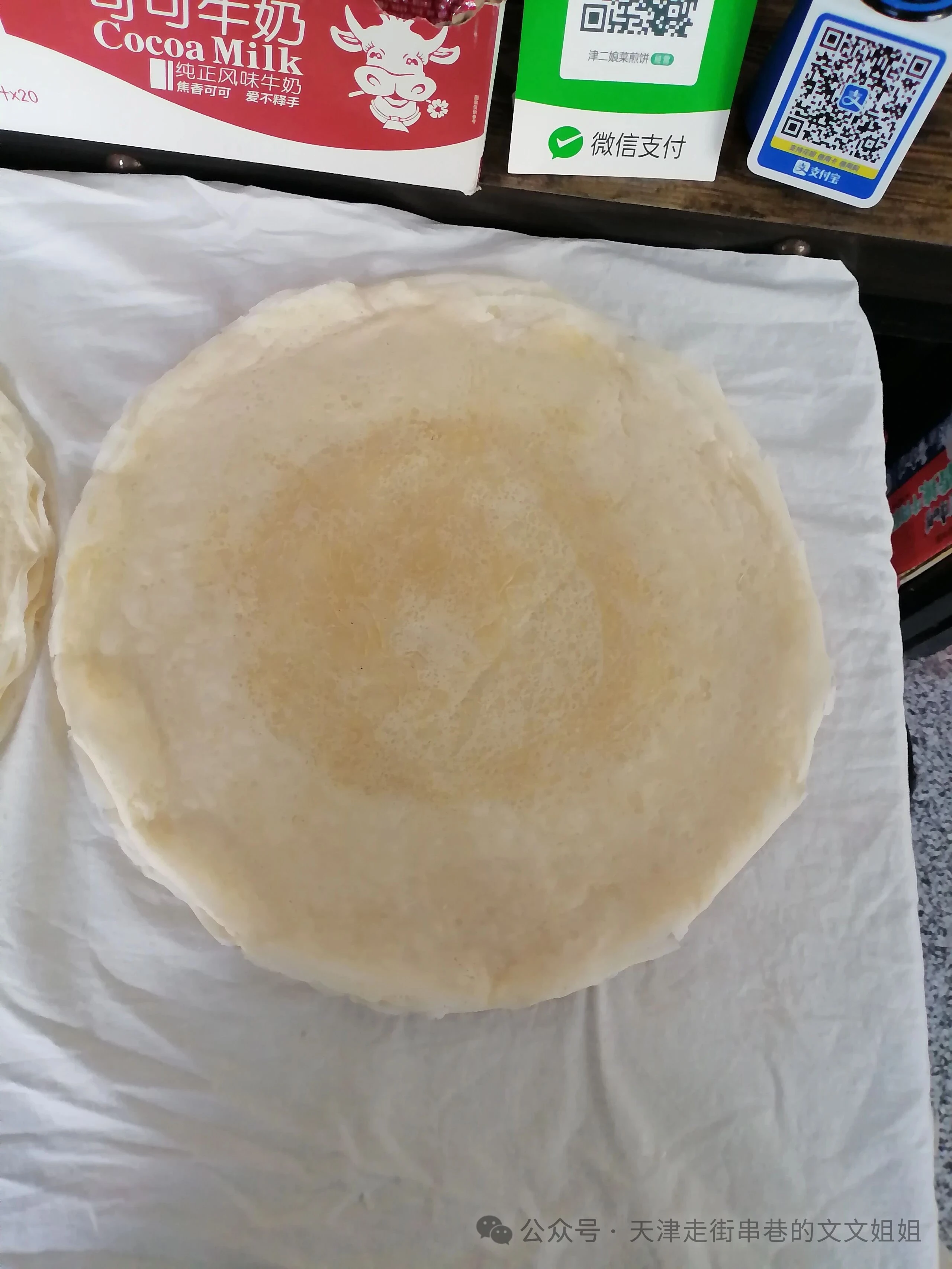 在丁字沽三号路上本溪路地铁站C口出来,有一家津二娘菜煎饼,之前是在勤俭道附近,现在搬到这边,先用鏊子烙的皮,皮是四种面混合的,在压上菜,中国版的轻食三明治,主打吃完不涨称,里面可以加牛肉,鸡蛋等等