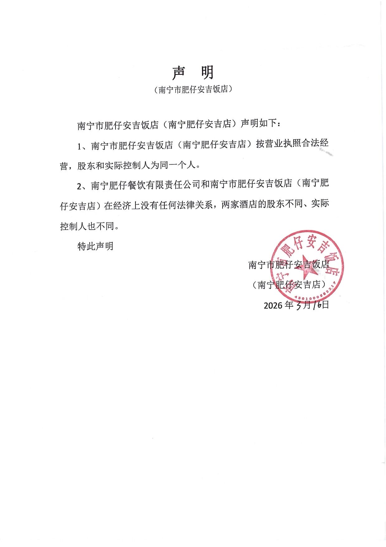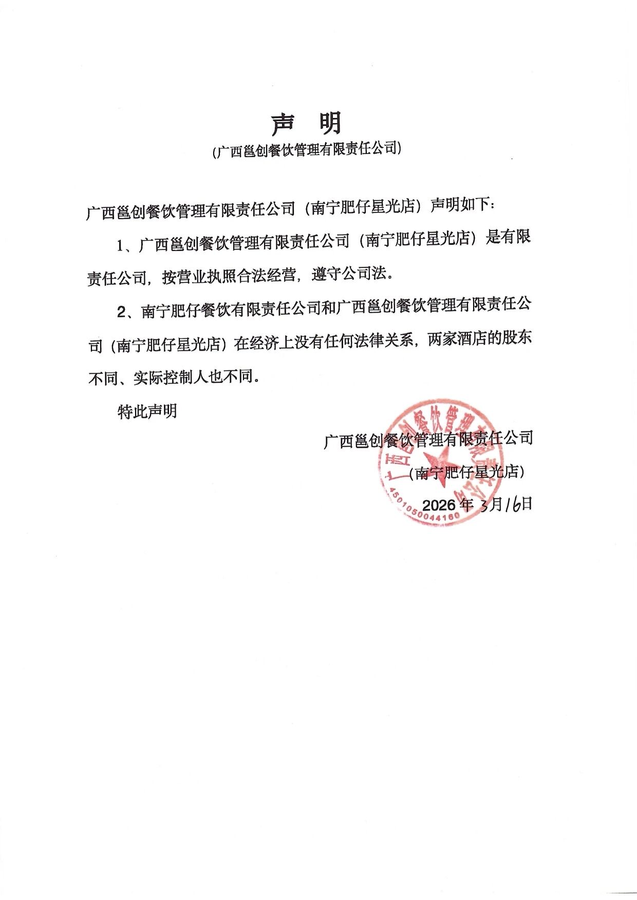 广西邕创餐饮管理有限责任公司(南宁肥仔星光店)、南宁市肥仔海鲜酒家(南宁肥仔人民店)、南宁市肥仔安吉饭店(南宁肥仔安吉店)、南宁邕信餐饮有限公司(南宁肥仔江南店)与南宁肥仔餐饮有限责任公司(南宁肥仔衡阳店、嘉和城店、大学店)并无法律和经济上的关联,并特此声明: