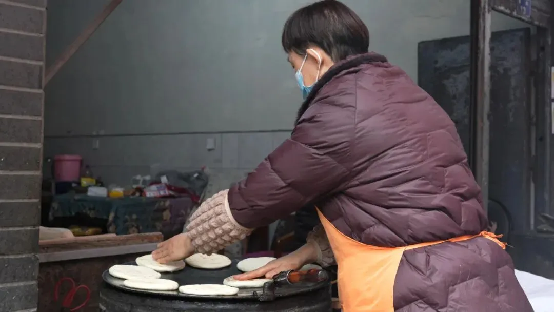 火炉里,薄厚相当、形状圆润的面饼围炉摆开,老板时不时地翻动,面饼表面慢慢地变成了焦糖色,刚刚填饱的肚子又为锅盔留出了一点位置。