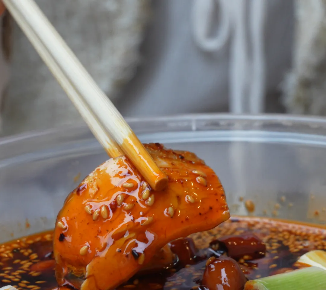 锅底菜品多样,豆腐、魔芋、木耳…食材本味相互交叠,激发出鹅肉本身特有的香气。鹅肉嚼劲十足,菜品软烂入味,浓烈的鲜辣口感之后,满口余香,这是名山特有的风味。