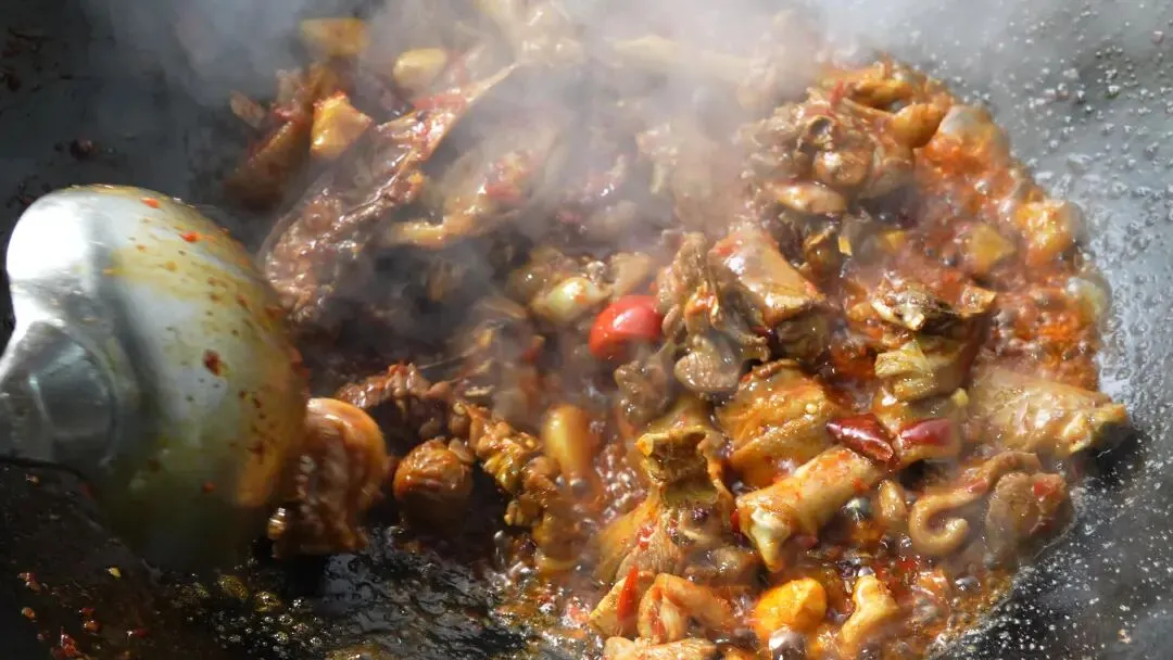 现炒的鸡肉,散发出独特的鸡肉香气,油脂被激发,更加均匀地包裹着每一块鸡肉。大火炖煮,鸡肉软烂入味,肉好吃,配菜也不逊色,土豆、芋儿耙糯适口,充分吸收了汤汁,每一口都鲜香四溢。