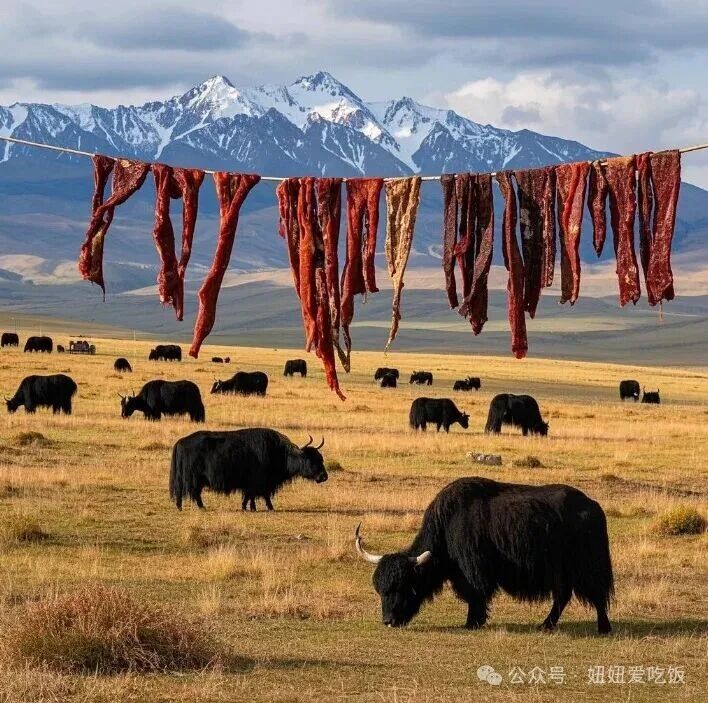 新鲜牦牛肉切成条,用盐和藏族特色香料腌制后,挂在通风处自然风干。由于高原气候干燥寒冷,牛肉很快就能晾好。做好的牛肉干嚼劲十足,越嚼越香,是补充体力的好食物,也是常见的零食。