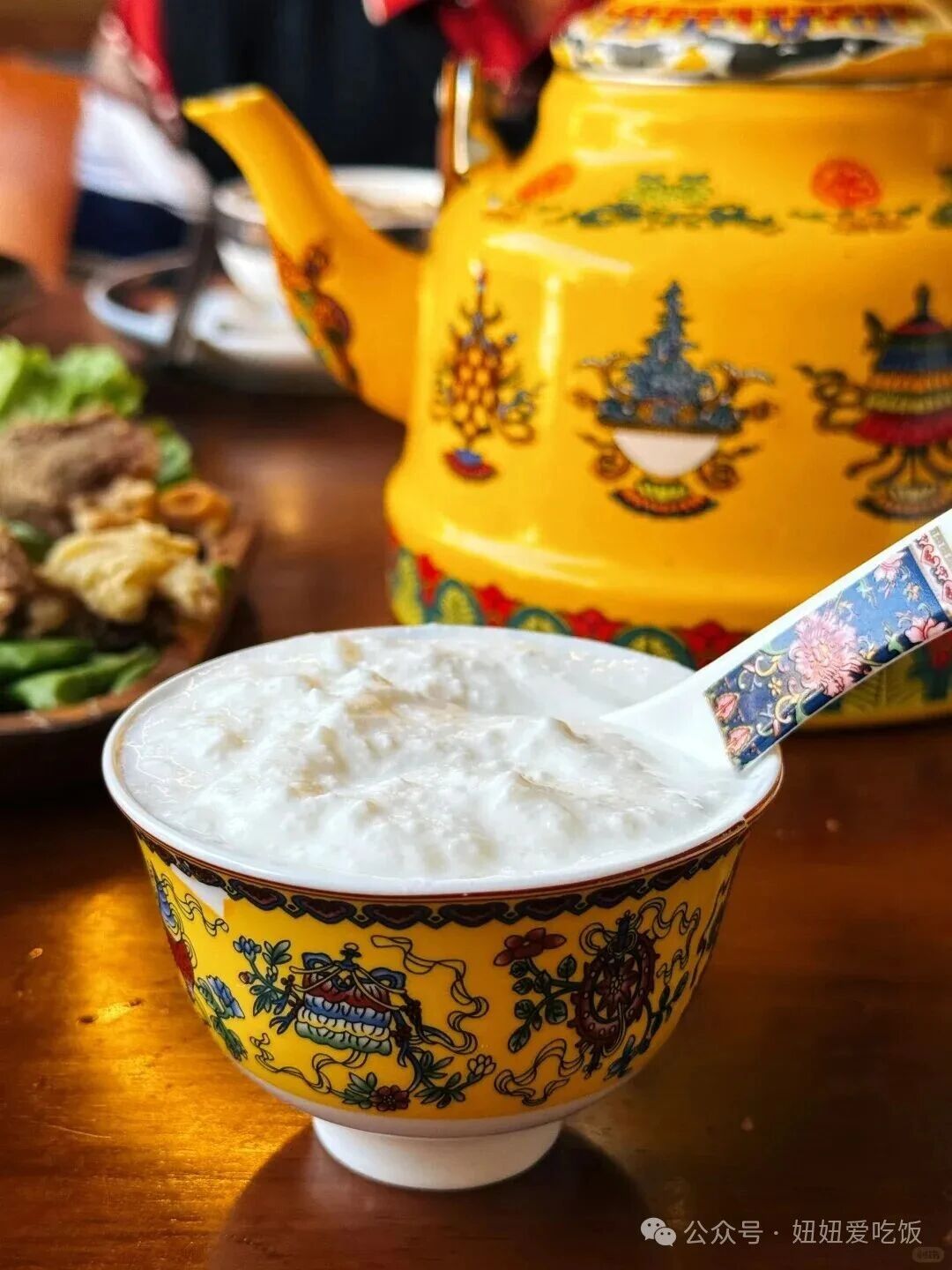 西藏的酸奶是用牦牛奶自然发酵而成,比普通酸奶更浓稠,酸味也更重。当地人吃的时候会撒上白糖,酸中带甜,口感细腻。在牧区,几乎家家户户都会自己做酸奶。