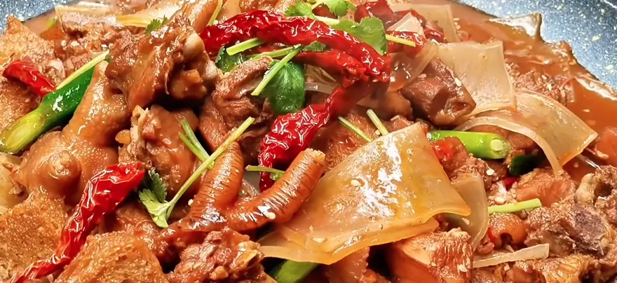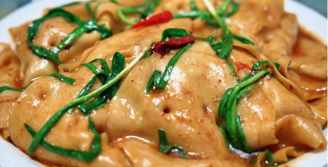 作为金塔人待客的招牌硬菜,土鸡焖饼承载着金塔的饮食记忆。选用散养土鸡,肉质紧实弹牙,经热油煸炒出浓郁肉香,加入高汤慢炖至汤汁醇厚。最精妙的是那薄如蝉翼的面饼,手工擀制后撕成碎片,铺在鸡肉之上一同焖煮,让每一片饼都充分吸饱鲜美的鸡汤与肉汁。
