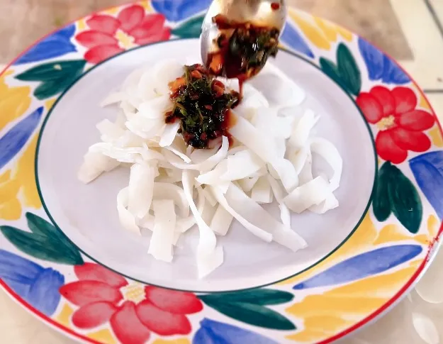 金塔椒麻鸡堪称丝路饮食融合的经典之作,吸纳了新疆椒麻风味的精髓,又融入本地饮食的豪迈底色,成为当地人餐桌上不可或缺的美味。选用本地散养土鸡,肉质紧实弹牙,经香料慢煮后撕成均匀块状,搭配翠绿青椒、葱段与洋葱丝,以秘制椒麻油充分拌匀。椒麻油的炼制是风味关键,以本地胡麻油融合大红袍花椒与鲜青花椒慢熬,香气醇厚绵长。成品色泽红亮诱人,入口麻香醇厚、辣而不燥,鸡肉的鲜醇与椒麻味完美交融,再搭配一碗筋道的金塔拉条面拌入汤汁,麻辣鲜香层层递进,酣畅淋漓,尽显西北风味的过瘾与实在。