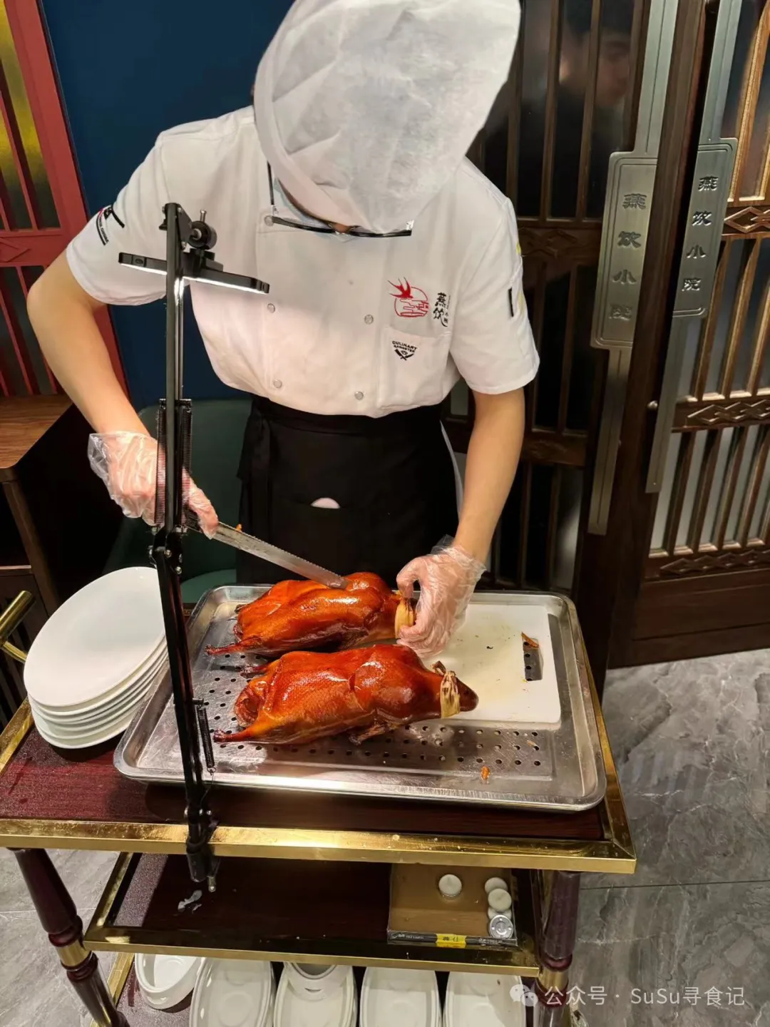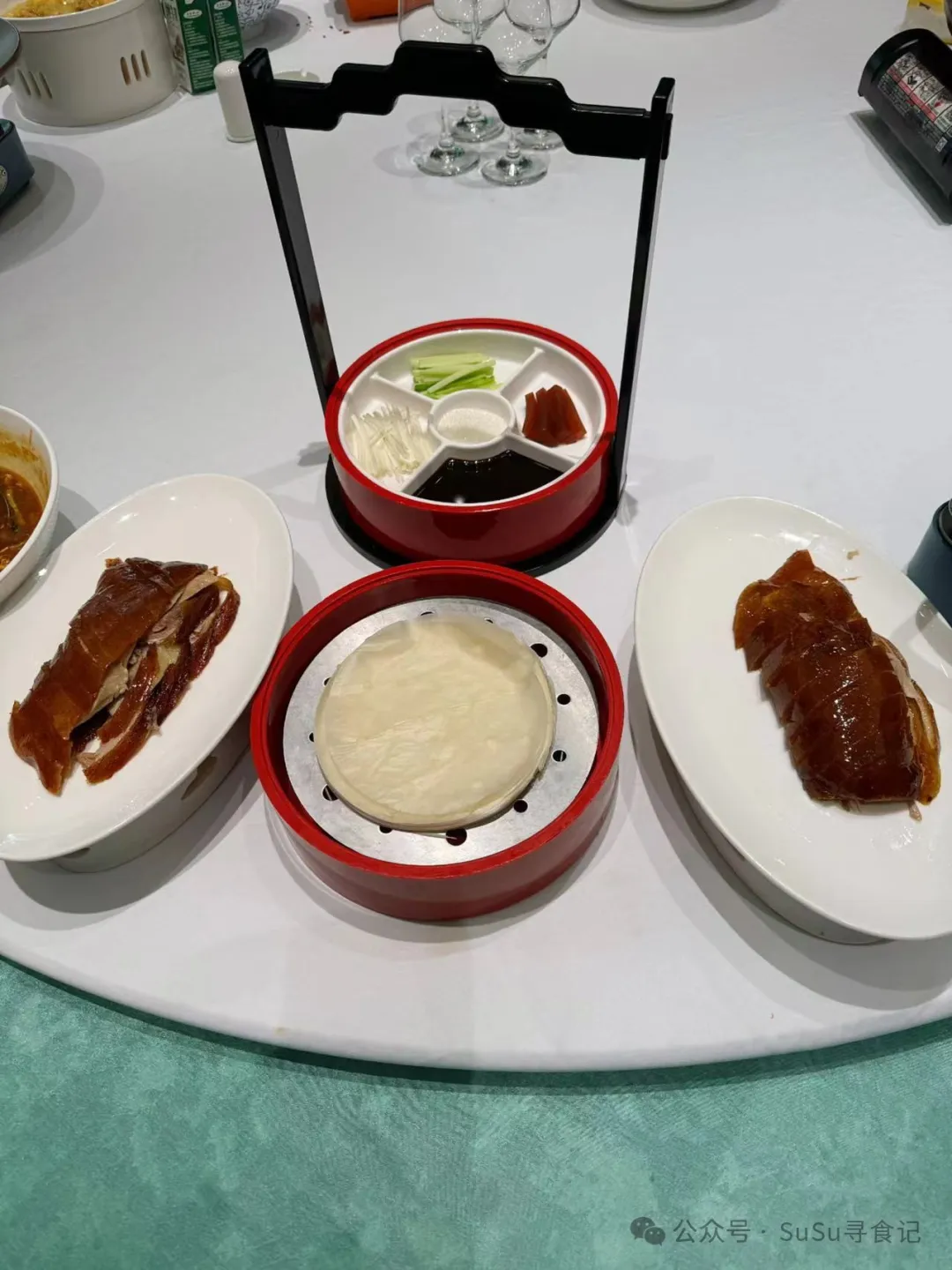 烤鸭两吃,鸭子做成片皮,鸭架凉拌。小师傅手法非常娴熟,配菜中包裹鸭子的有黄瓜,大葱,山楂条,烤鸭酱和白糖。面饼每层中都有油纸隔开,避免了撕不开或者几片黏在一起的问题。凉拌鸭架整体口感还不错,就是辣鲜露放的有点多了,反而口感上有点喧宾夺主吃不出鸭子的香味了。
