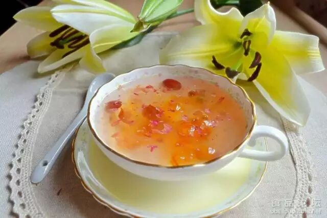 5、待甜汤水温去到80-90度,下洛施玫瑰花,舀甜汤反复冲泡花朵,待其倾其所有!