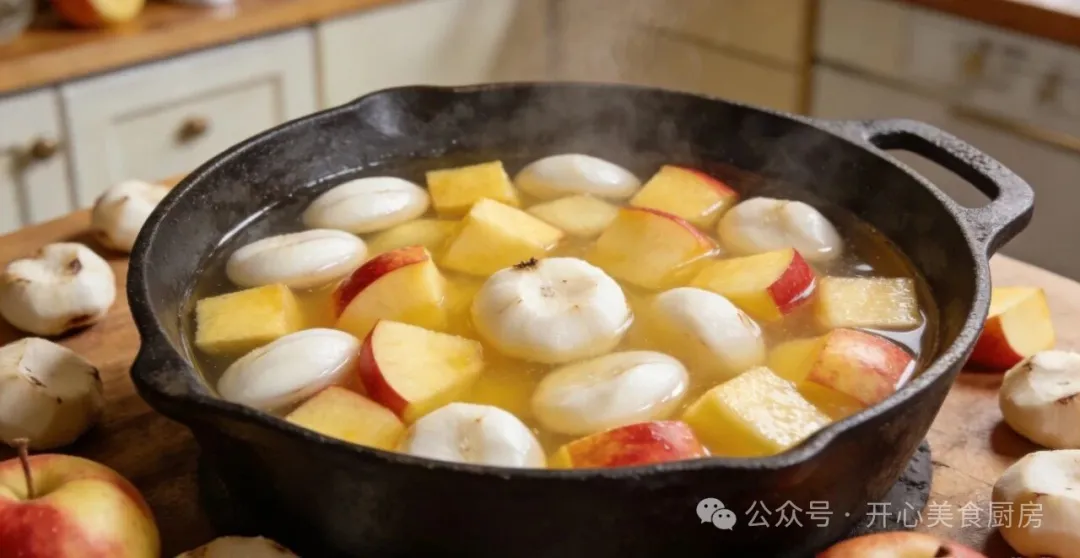 锅中倒入准备好的清水,放入处理干净的马蹄和苹果块,大火烧开后转小火慢炖 20-30 分钟,直到马蹄变得软糯、苹果的香气完全释放出来。最后根据口味加入冰糖,搅拌至融化后关火,放温后饮用口感最佳,不会刺激肠胃。