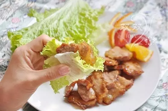 果汁腌肉,会提升肉类的清新口感,降低油腻度,趁热包上生菜,大块朵颐吧!