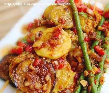 ❶ 将所有材料洗净后,茄子,黄瓜,西葫芦切成大约0.5cm厚的圆片(试验证明,太厚了不易进味,太薄了不好串上竹签),豇豆切段,红椒取半个切块。