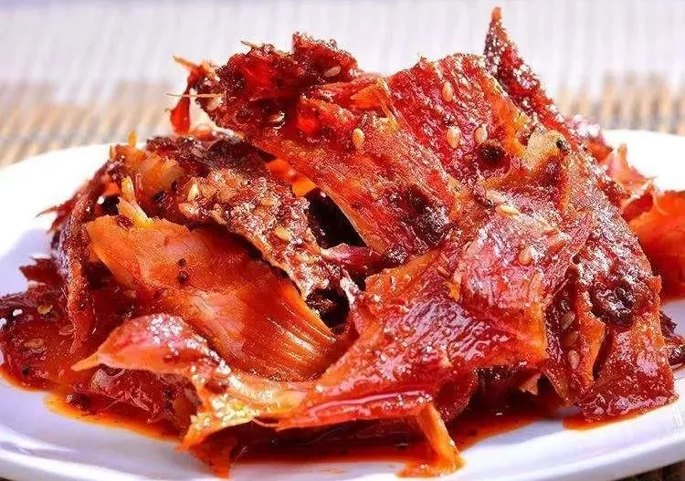 牛肉1000克,改成宽条,加入葱姜,黄酒腌制半小时,下入开水锅内煮至熟透捞出冲凉,下入油锅内炸制定型,另起锅加入辅料炒至出香味,加入牛肉翻匀即可。