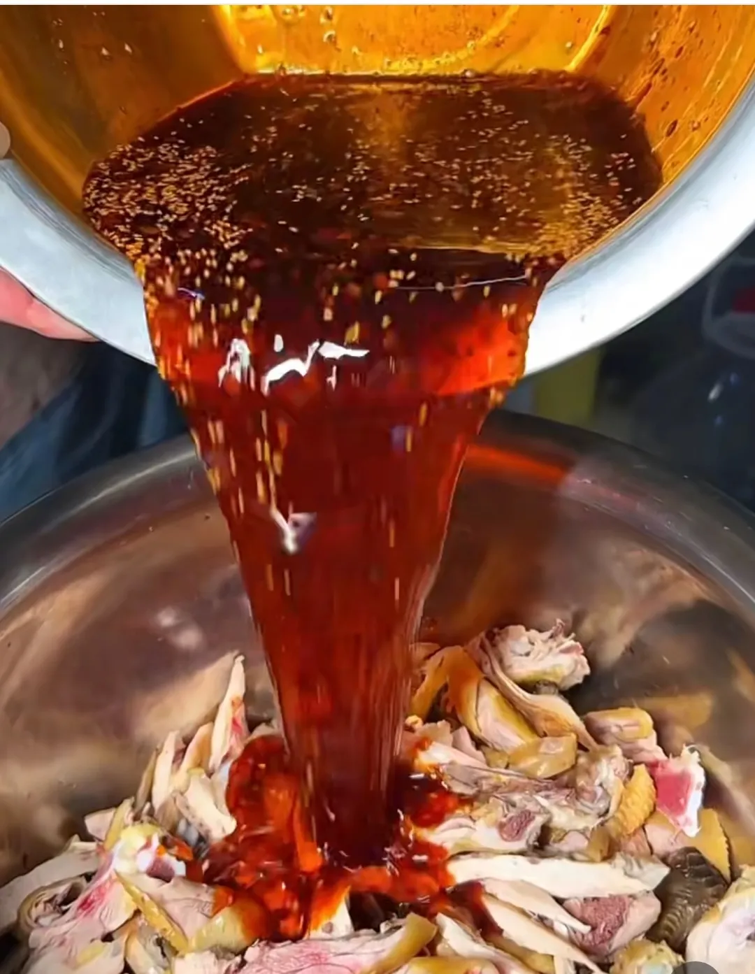 4.锅中加入菜籽油烧至260度,加入鸡油,油温降至180度开火,加入小葱、生姜、大葱、香菜、香料炸制表面金黄捞出。