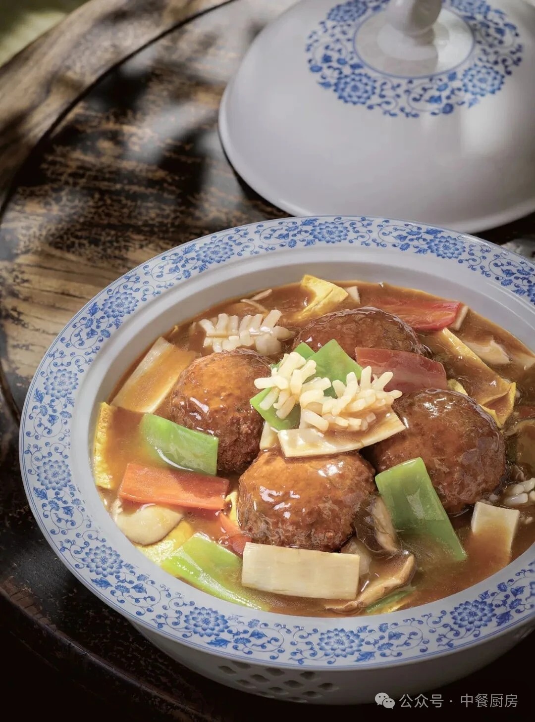 3.将青笋片、胡萝卜片、鱿鱼花、冬笋片、香菇片、鸡蛋皮汆水后加入原汤,勾芡成汁,舀到圆子上即可。