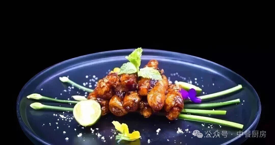 3.锅留底油,下老姜片10克、葱结3个煸香,倒入可乐一瓶(500毫升),加八角2个、香叶3片、小茴香0.1克,调入冰糖75克、盐20克、老抽20克、白胡椒粉5克,倒入炸好的鸡翅根,大火煮开后转小火烧透(约6分钟),再转大火将汤汁收浓,起锅装盘,待放凉后,点缀小青桔、薄荷等即可走菜。
