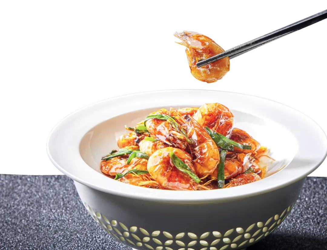 采用两次复炸工艺,保证虾壳酥脆、虾肉鲜嫩。自制虾汁融合黄酒、米醋、生抽等,酸甜平衡,风味独特,上桌锅气缭绕。
