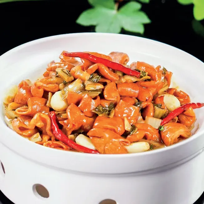 精选二股肠,肥油少,成本更低。处理环节用白酒揉搓去腥,炒制时加入大量皱皮椒、小米辣和蒜泥,成品筋道红亮,毫无异味,在重口味区域极受欢迎。