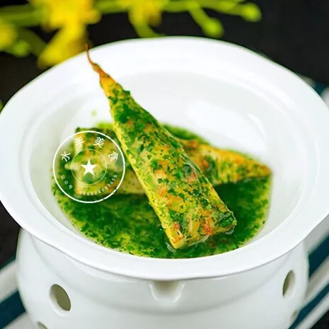 4、锅入开水450克,倒入鸡汁10克搅匀,大火烧开,调入盐1克、白胡椒粉3克,勾薄芡后倒入鸡蛋液搅匀烧开,再放入荠菜末烧开,起锅入盛器,带一碟炸刀鱼上桌,由客人将炸刀鱼撒在荠菜羹中食用。