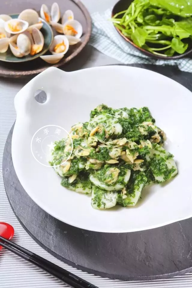 此菜在“荠菜炒年糕”的基础上,加入了色泽金黄的黄蚬子,提亮菜品色泽,同时增加鲜味。这道菜若在宴席上推出,则可更名为“黄金碧玉炒年糕”。