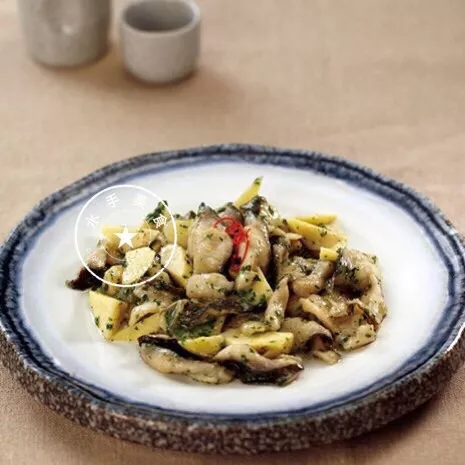 3. 荠菜末入热锅用油爆香后把鲜笋鱼肉放入,加入家乐浓缩鸡汁后兜匀勾芡即可。
