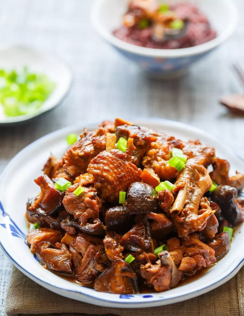 食材:鸡、香菇、葱、姜、料酒、老抽酱油、冰糖、盐适量。