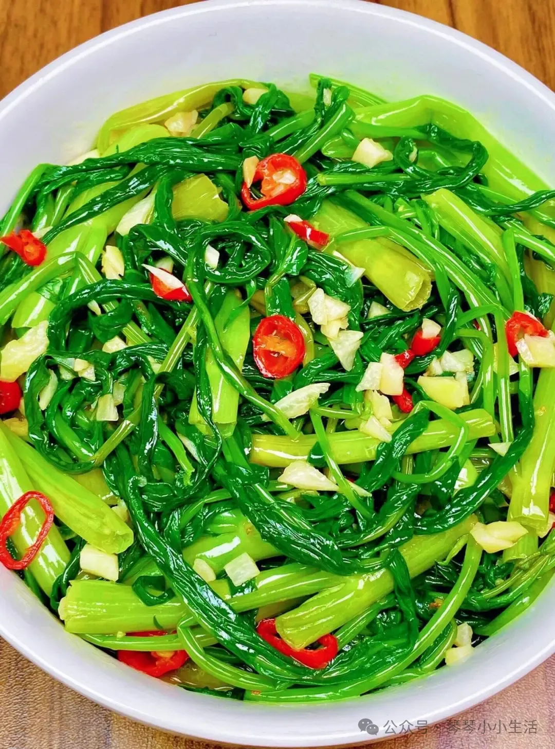 简单食材极致搭配唯一主角:空心菜一把,越嫩越好。灵魂伴侣:大蒜一头(对,是一头),剁成细末。调味:只用盐、少许糖(提鲜)即可,最多可以加一点蚝油。