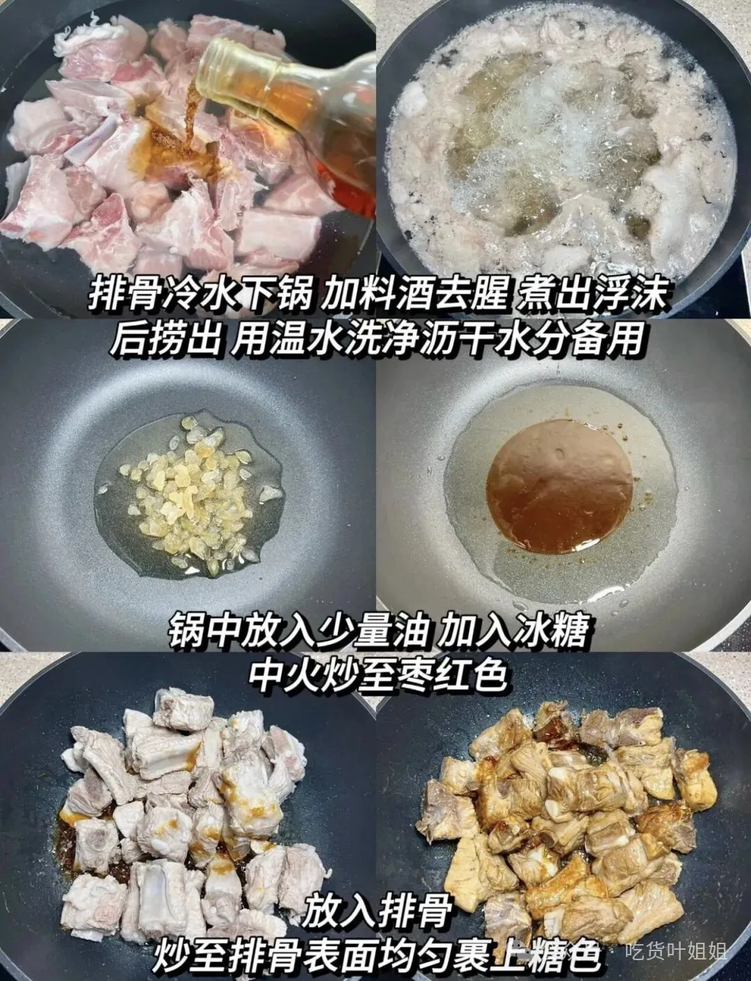 1. 排骨冷水下锅,加料酒去腥,煮出浮沫后捞出,用温水洗净沥干。